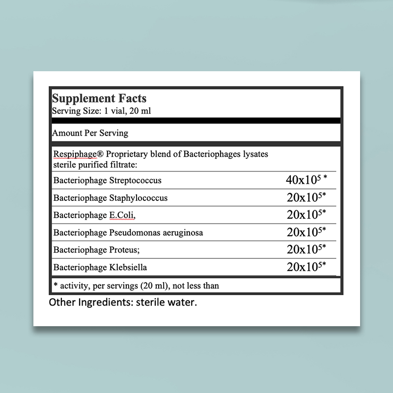Respiphage® is a proprietary blend of Bacteriophages lysates sterile purified filtrate with the following benefits: